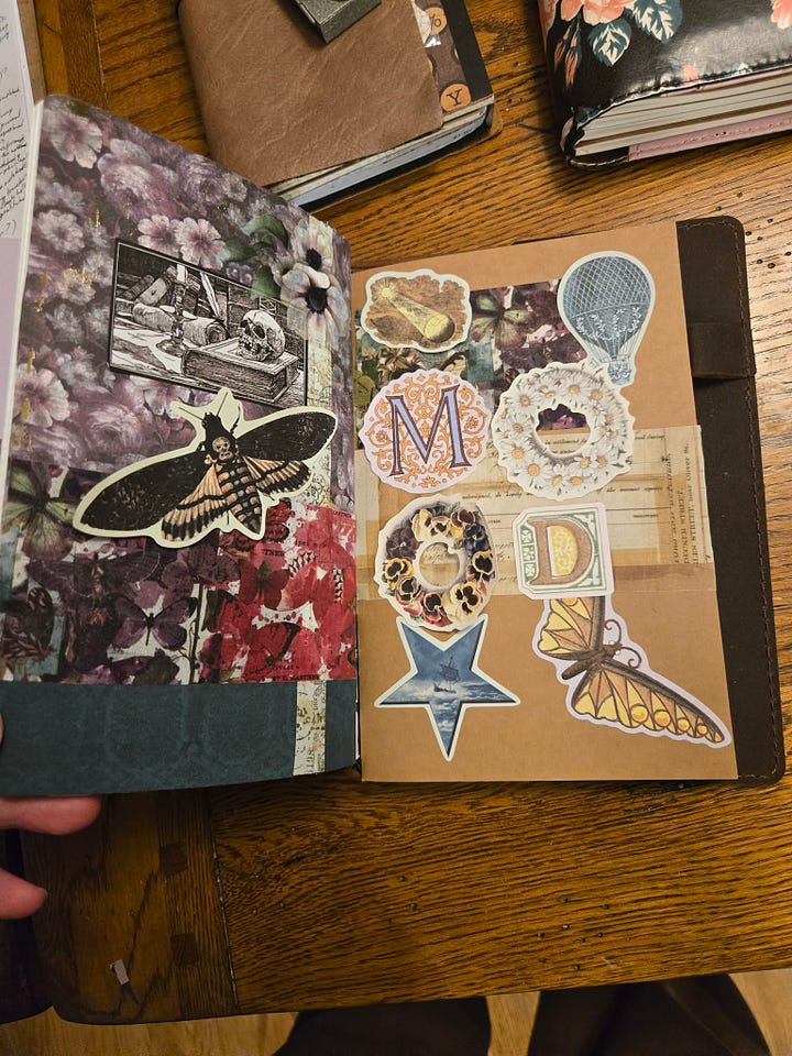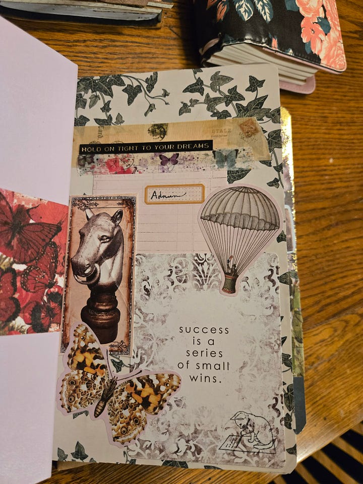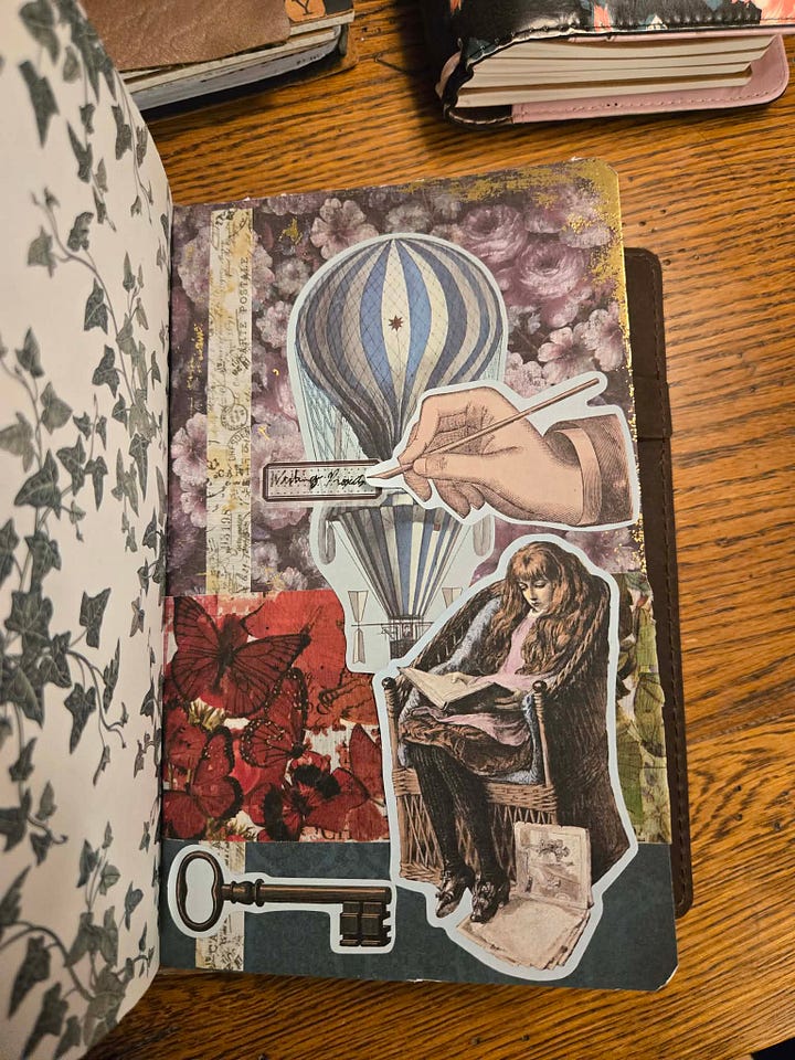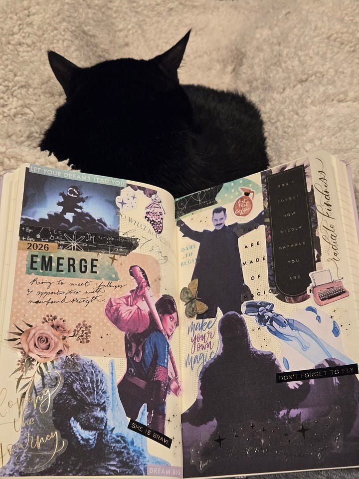 Interior of my main journal system, complete with a slightly unhinged motivational mood board for my Word of the Year for 2026, “Emerge”: