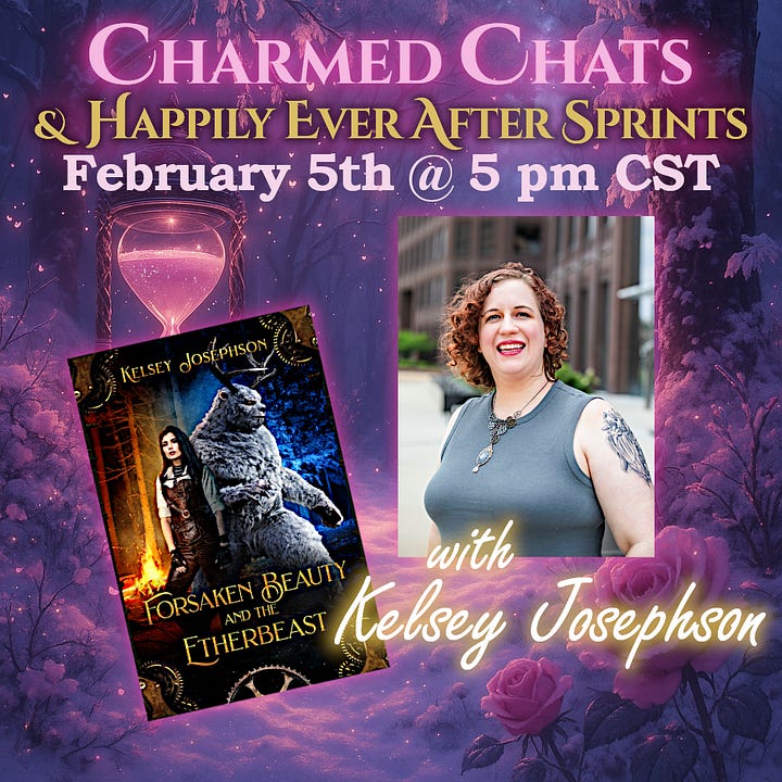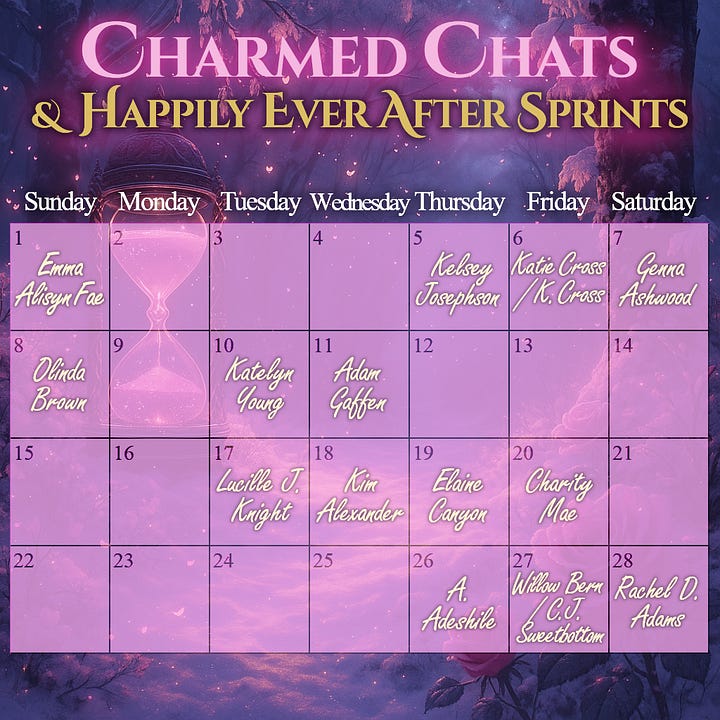 On Thursday, February 5th, at 5 pm Central time, I’m joining S.D. Huston live on her YouTube channel for Charmed Chats & Happily Ever After Sprints! We’ll be discussing writing craft, romantasy, play games, and spend some time writing. You can watch at the link here (click the notification bell for a reminder.)