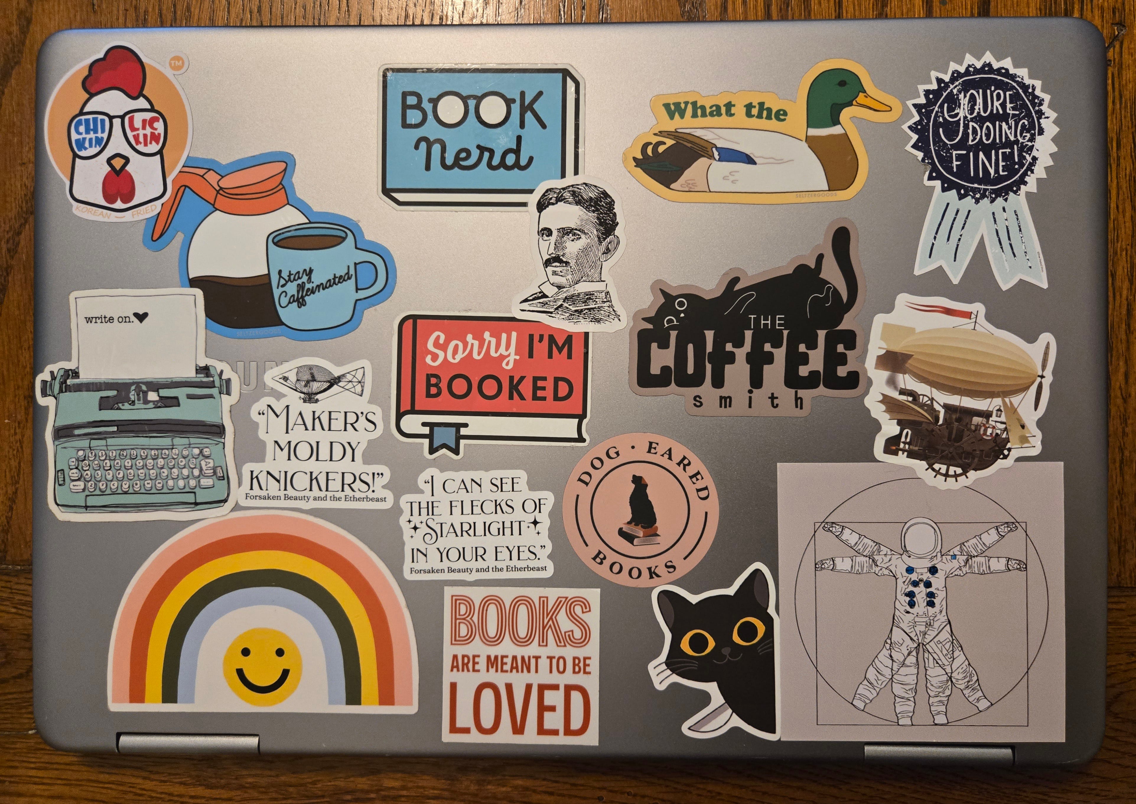 Before I get to my schedule, here are the new stickers I’m debuting at the steampunk convention. These are vinyl, perfect for Kindles and laptops. They feature quotes from Forsaken Beauty and the Etherbeast, and also a tiny Nikola Tesla, because I very rarely see him on anything. (I’d love to have Nikola Tesla and Ada Lovelace action figures for my office to go with my Leonardo da Vinci one, but no such luck yet.)