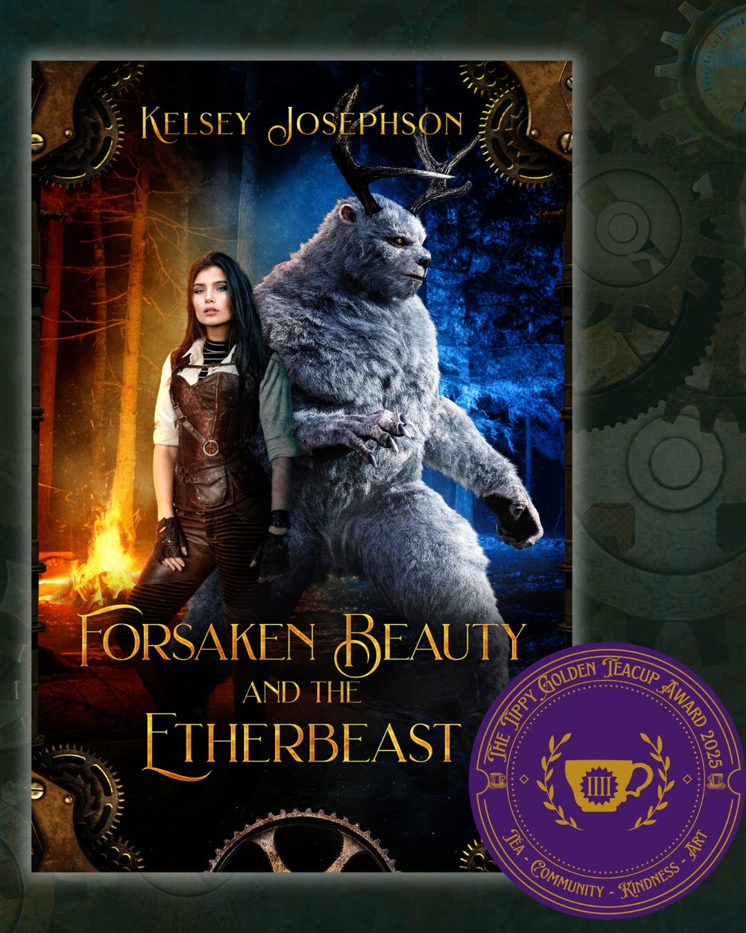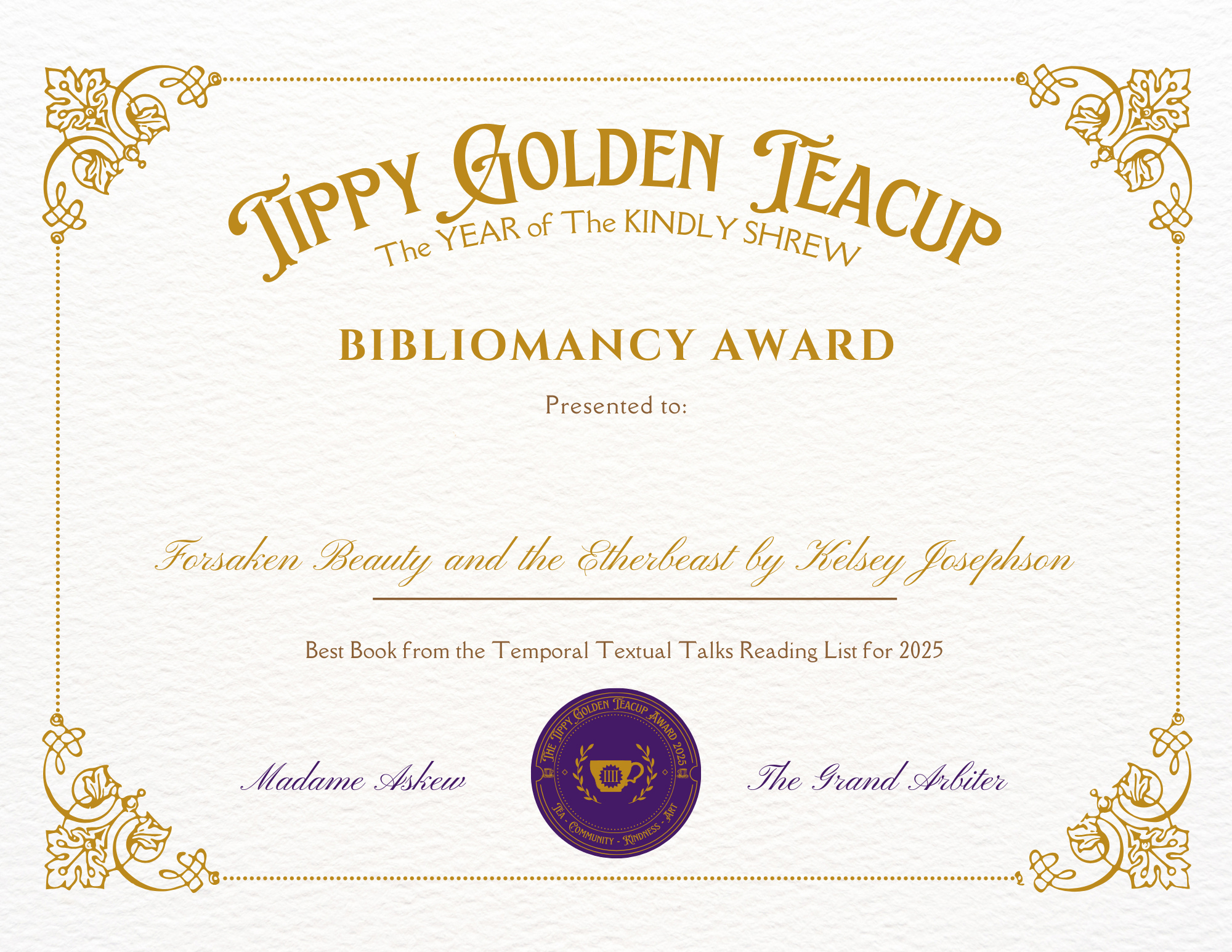 Imagine my surprise and delight when I heard my name called. Forsaken Beauty and the Etherbeast won the Tippy Golden Teacup Award for Bibliomancy! I had a little bit of panic when I was sent a message to join the Live later on in the show and I was still dressed for a snow day at home. I have a closet full of gorgeous outfits for conventions and fantasy balls, but I ended up accepting my award in a sweatshirt. At least it was a cute one! 😂