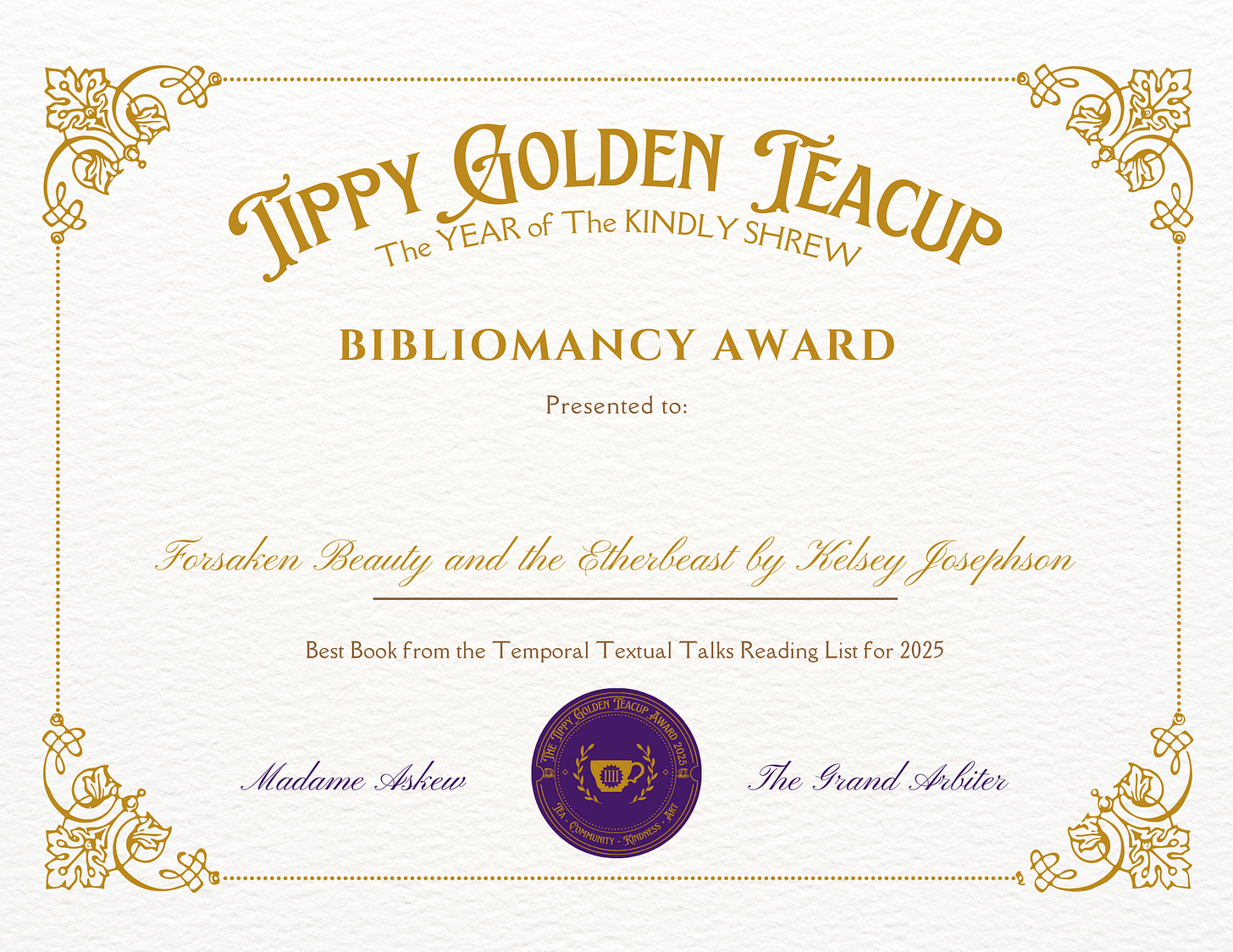 My book, Forsaken Beauty and the Etherbeast, was up for the Bibliomancy Award, along with the other books on the reading list for Temporal Textual Talks: A Steampunk Book Club. I was elated to be in the company of Gail Carriger, T. Kingfisher, Theodora Goss, and so many other authors I admire!